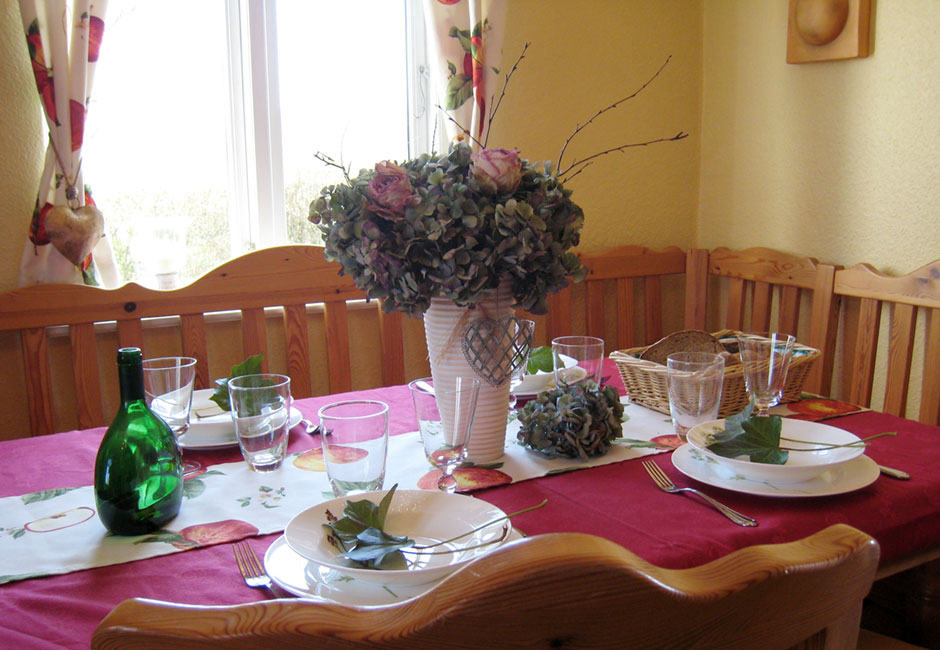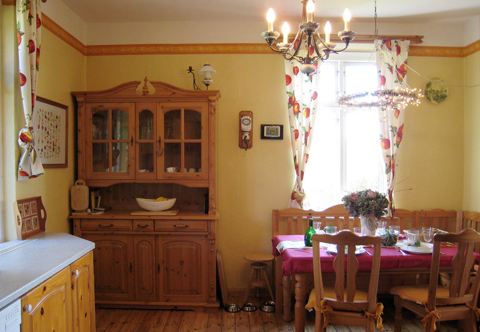Im Erdgeschoss befindet sich eine sehr gut ausgerüstete Küche mit einer gemütlichen Essecke. Die Küche ist mit Ceranherd inklusive Backofen, Geschirrspüler, Kühlschrank mit 3-Sterne Gefrierfach, Toaster, Kaffeemaschine, Kaffeepadmaschine, Mixer, Wasserkocher sowie Kaminofen ausgestattet.