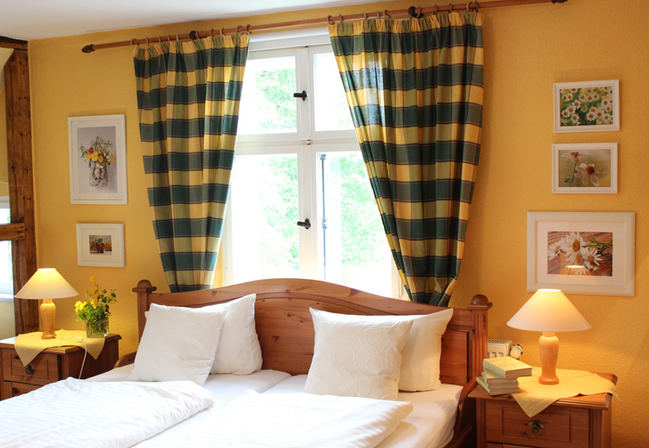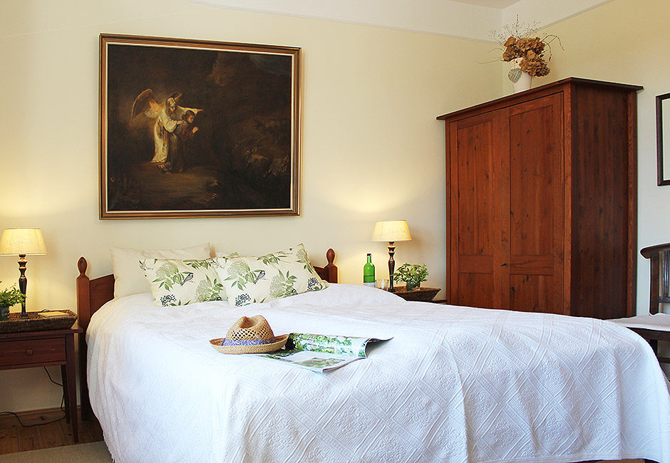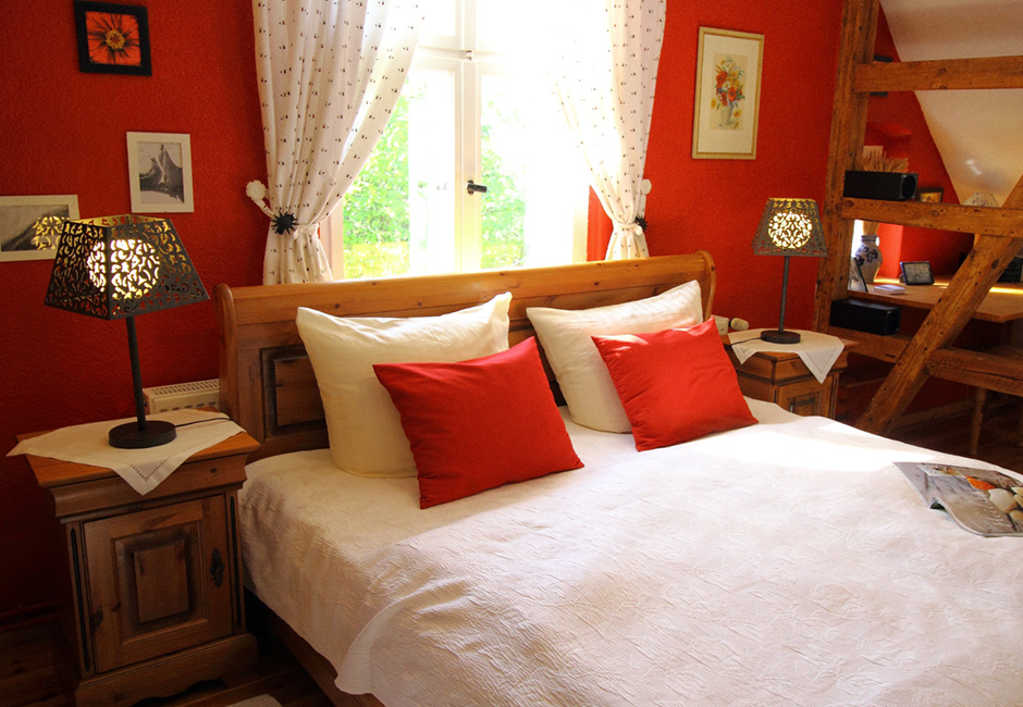 Das Schlafzimmer im EG mit separatem Zugang zum Bad, ist ausgestattet mit einem Doppelbett, Kleiderschrank, SAT-TV, Bücherregal und Sekretär sowie einem Kachelofen.