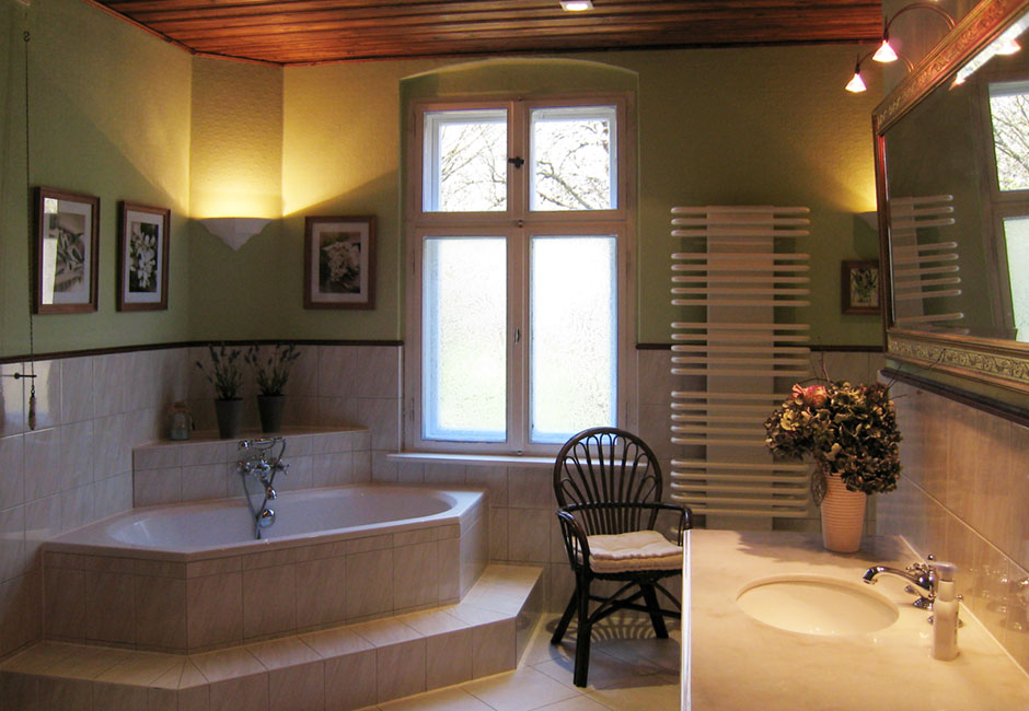 Ein großzügiges Bad im EG, ausgestattet mit Badewanne, separater Dusche, WC, großem Waschtisch, Fußbodenheizung, Handtuchtrockner und Haartrockner, lädt zum Relaxen ein.